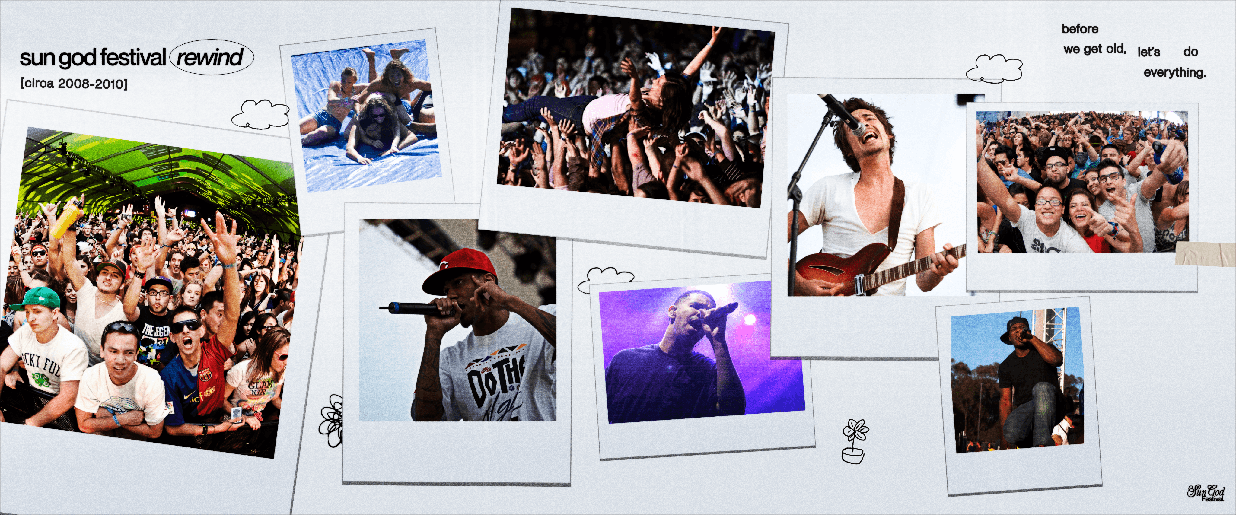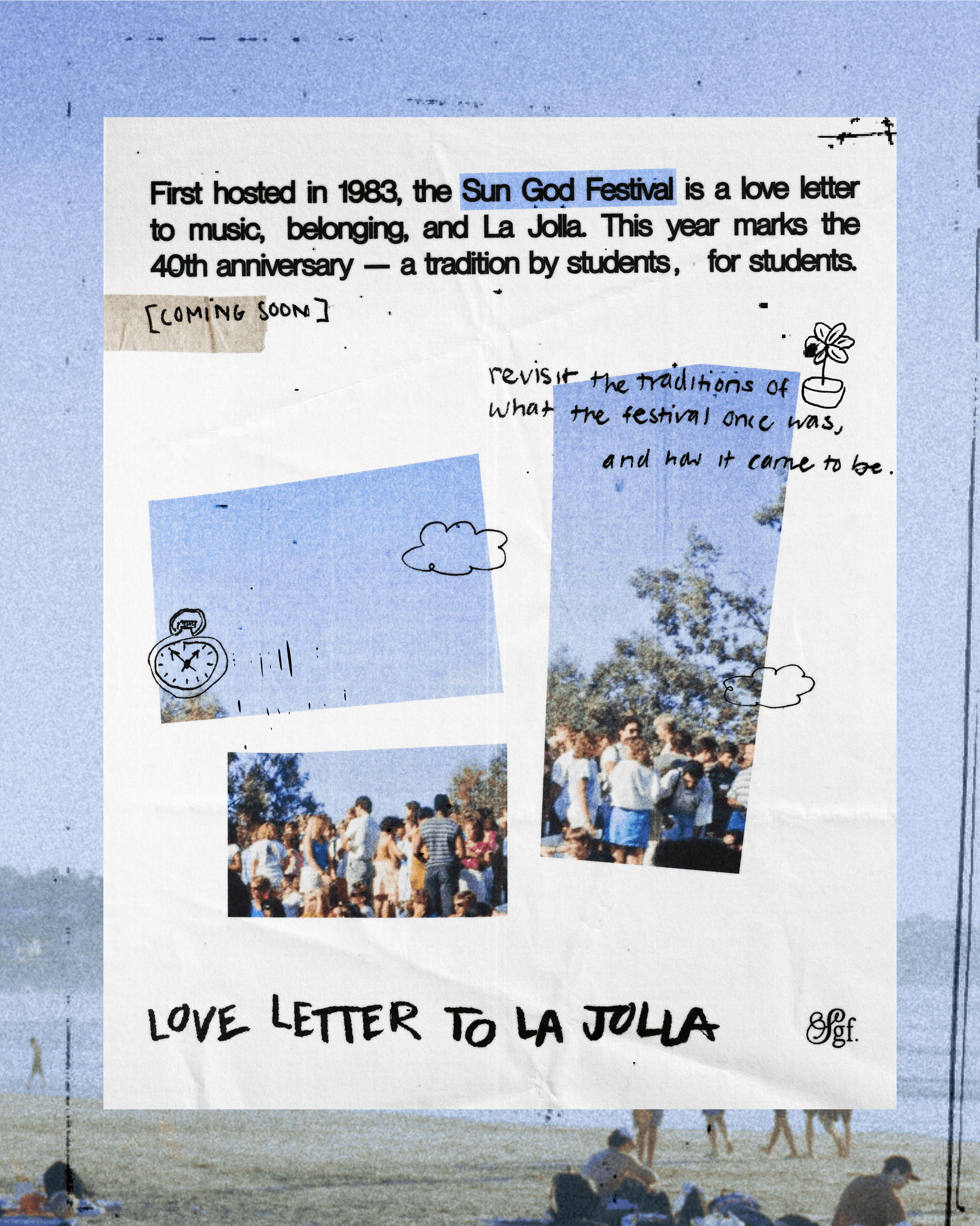 This year's Sun God Festival theme is about revisiting the history of the festival and what it means to UCSD. When defining the visual identity, I pieced together vintage film photos, polaroids, letters, and physical media that encapsulated the nostalgic feeling I wanted students to feel. Unlike past campaigns, this photo-based branding of the campaign was integral to our messaging — grounding the campaign to a real community here in La Jolla.
