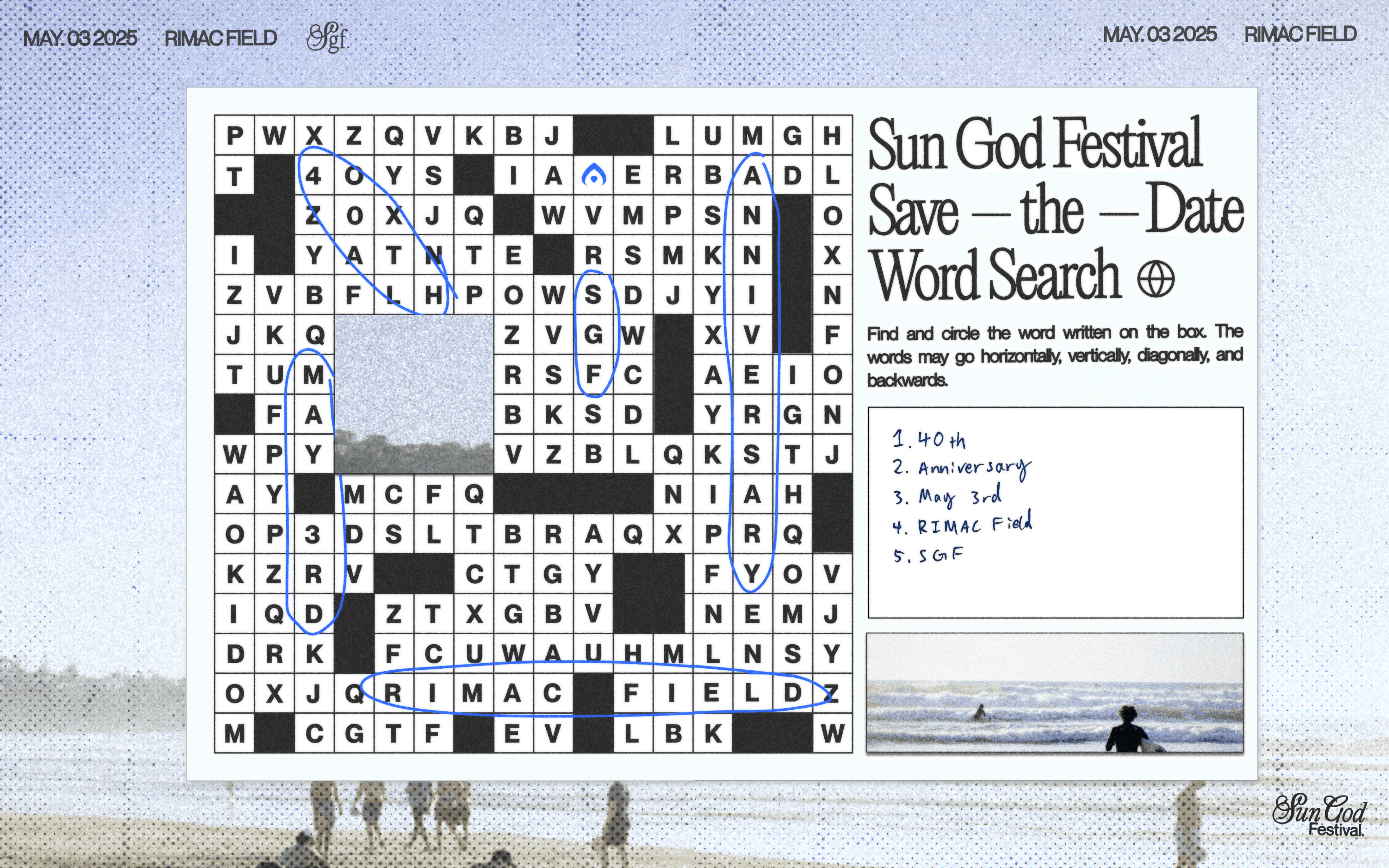 Newspaper style crossword puzzle announcing the date of the festival. All images on the graphic taken by our photographer at La Jolla Shores.