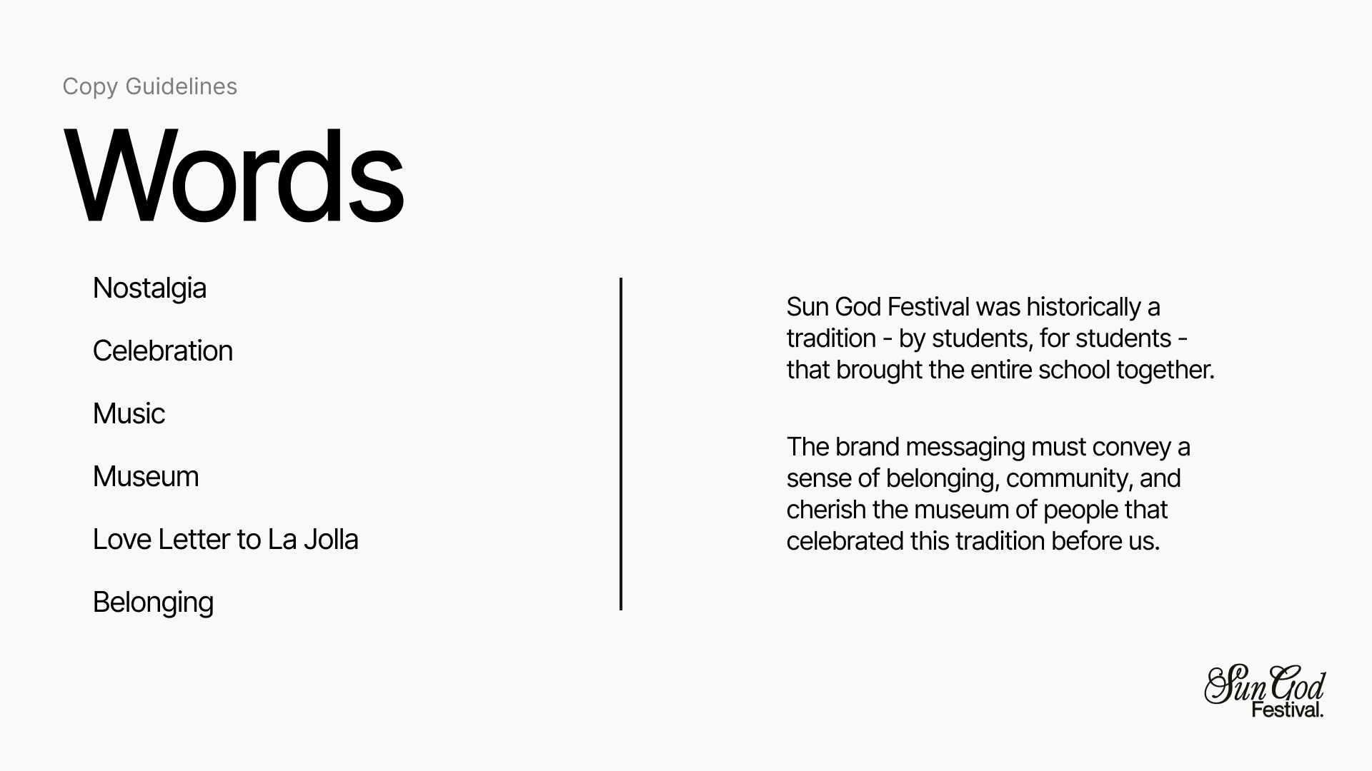 2025 marked the 40th anniversary of the campus-wide tradition. SGF hitting 40 years was an important milestone that I wanted to highlight at the center of the campaign. For context, Coachella has only been around for 26 years. This festival represents the school, city, and students that came before us. When brainstorming, I centered my campaign around 3 core themes to bring visual and emotional elements into a compelling narrative: