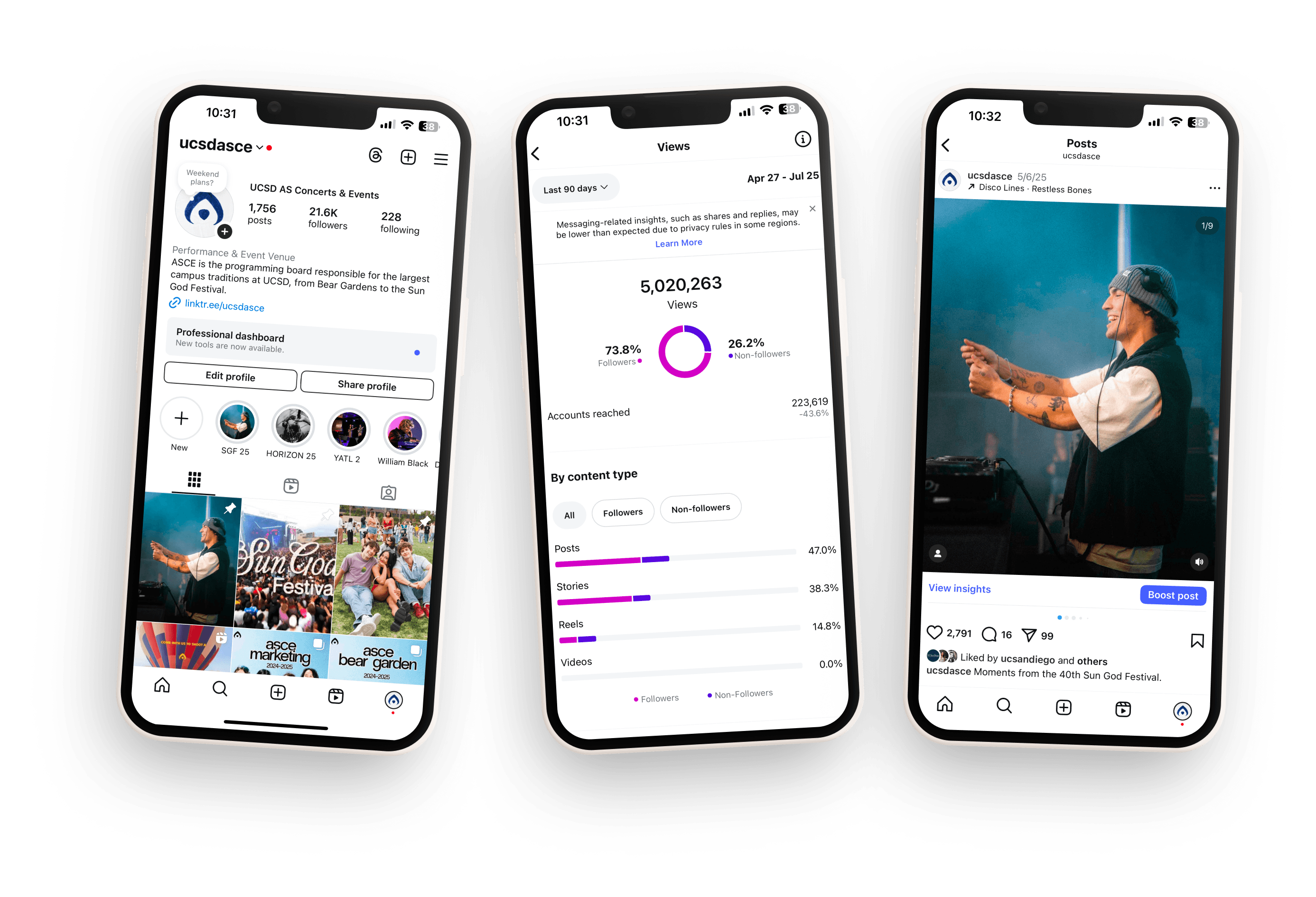 Ahead of the show, I coordinated marketing deliverables with my media team to capture real student experiences — from fun artist segments to interviews with students about their favorite festival moments. Our recap content earned over 289,000 views and sparked strong post-event engagement.